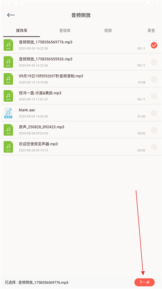 3、在倒放的頁面內(nèi),選擇并勾選視頻后點(diǎn)擊右下角下一步的按鈕。