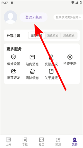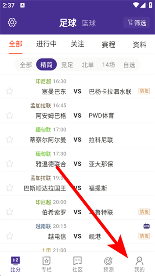 1、打開(kāi)捷報(bào)比分app,在首頁(yè)點(diǎn)擊底部我的,進(jìn)入個(gè)人的頁(yè)面。