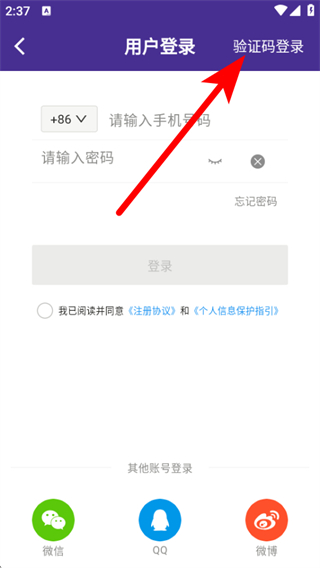 3、在用戶(hù)登錄界面點(diǎn)擊驗(yàn)證碼登錄,進(jìn)入驗(yàn)證碼登錄的頁(yè)面。