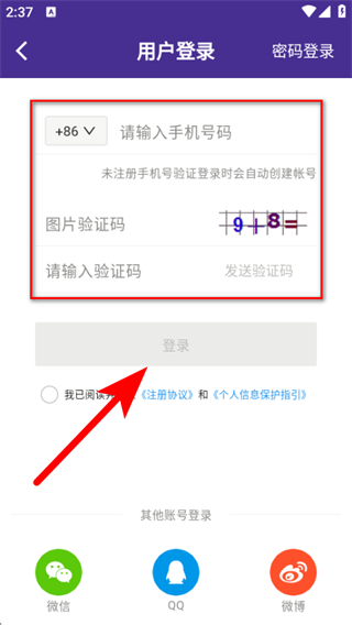 4、在驗(yàn)證碼登錄頁(yè)面輸入手機(jī)號(hào)等信息,點(diǎn)擊登錄按鈕,完成注冊(cè)操作。