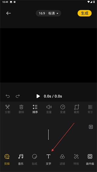 3、進(jìn)入剪輯的界面內(nèi),用戶需點(diǎn)擊下方文字的功能按鈕。
