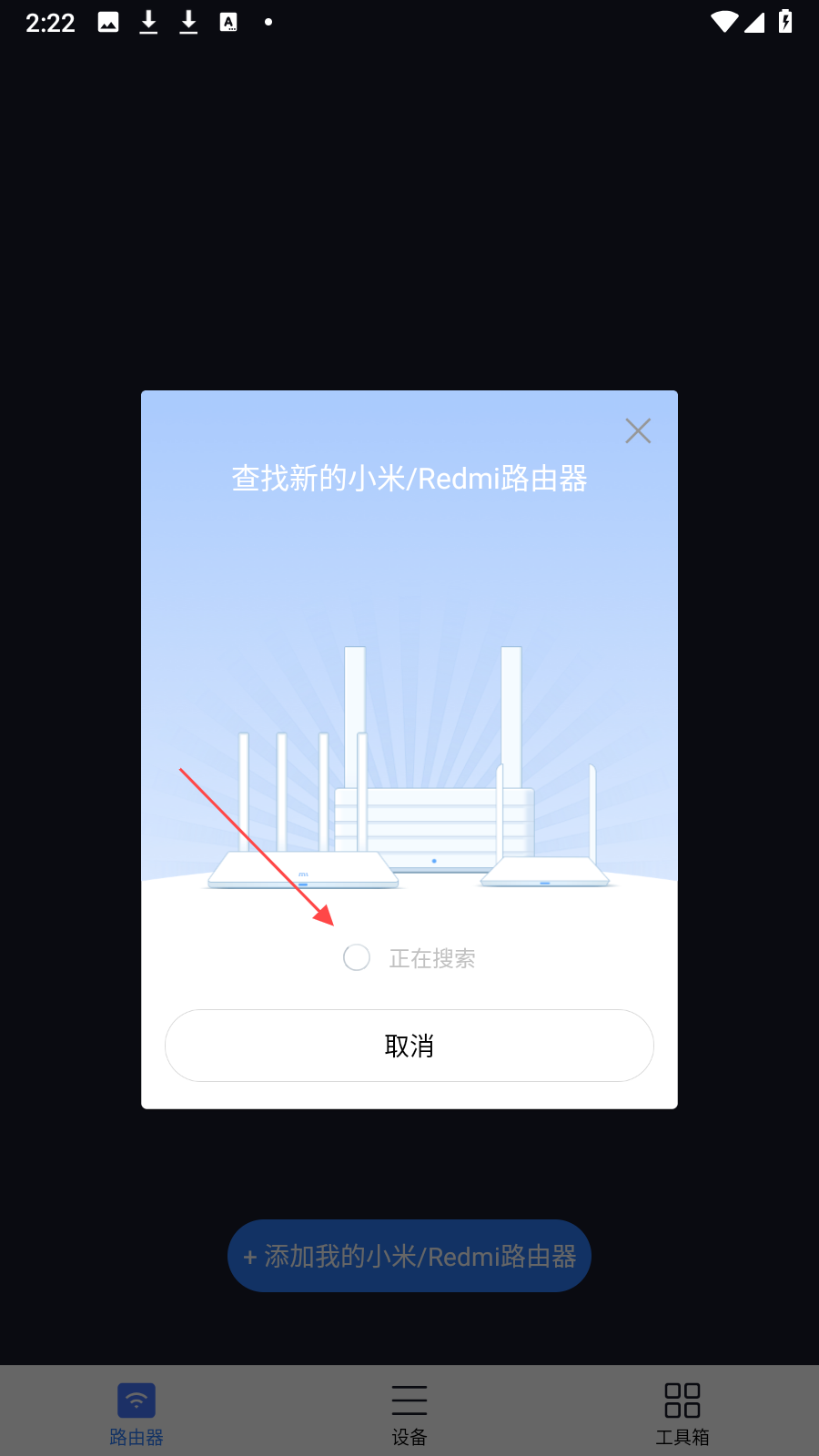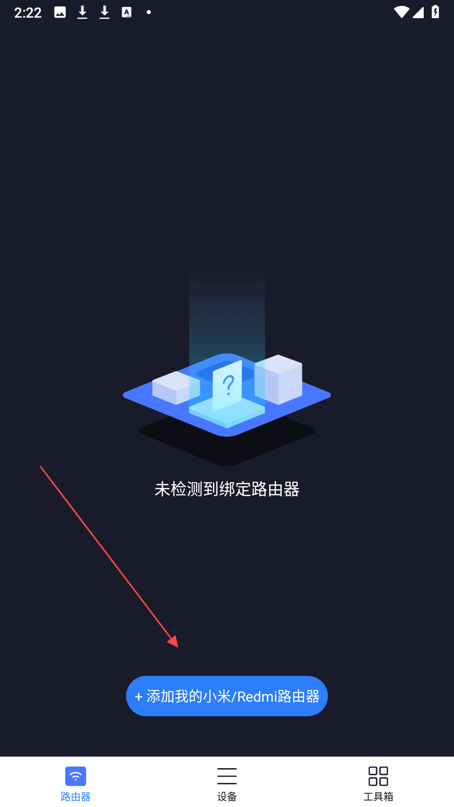 2、進(jìn)入應(yīng)用主界面,點(diǎn)擊下方藍(lán)色的+添加我的小米/Redmi路由器按鈕,開始搜索附近可連接的小米或Redmi路由器。