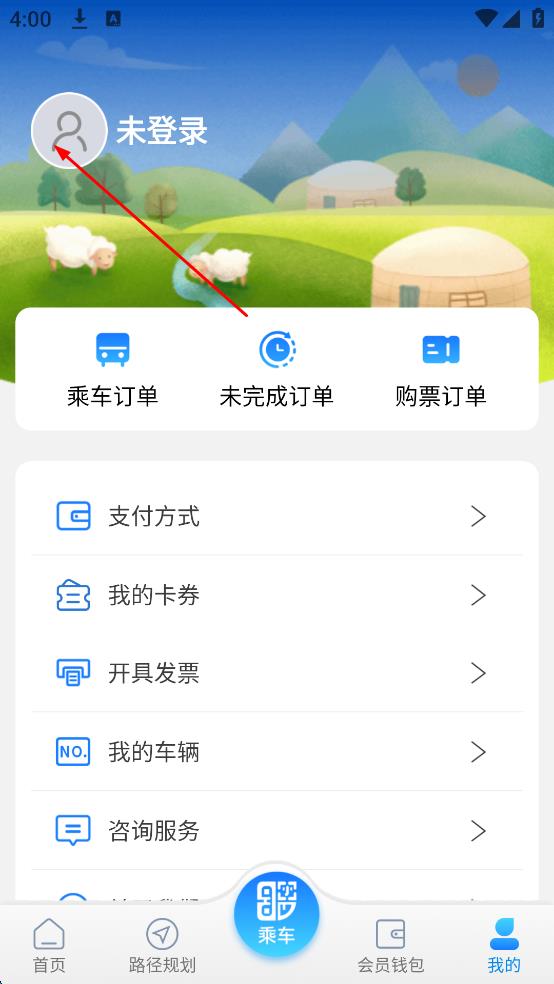 1、打開(kāi)青城地鐵應(yīng)用,進(jìn)入“我的”頁(yè)面,點(diǎn)擊上方“未登錄”頭像區(qū)域,跳轉(zhuǎn)至登錄界面 。
