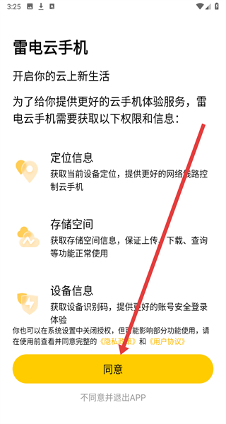 1、在雷電云手機APP的權(quán)限提示頁面點擊“同意”,進入登錄界面。