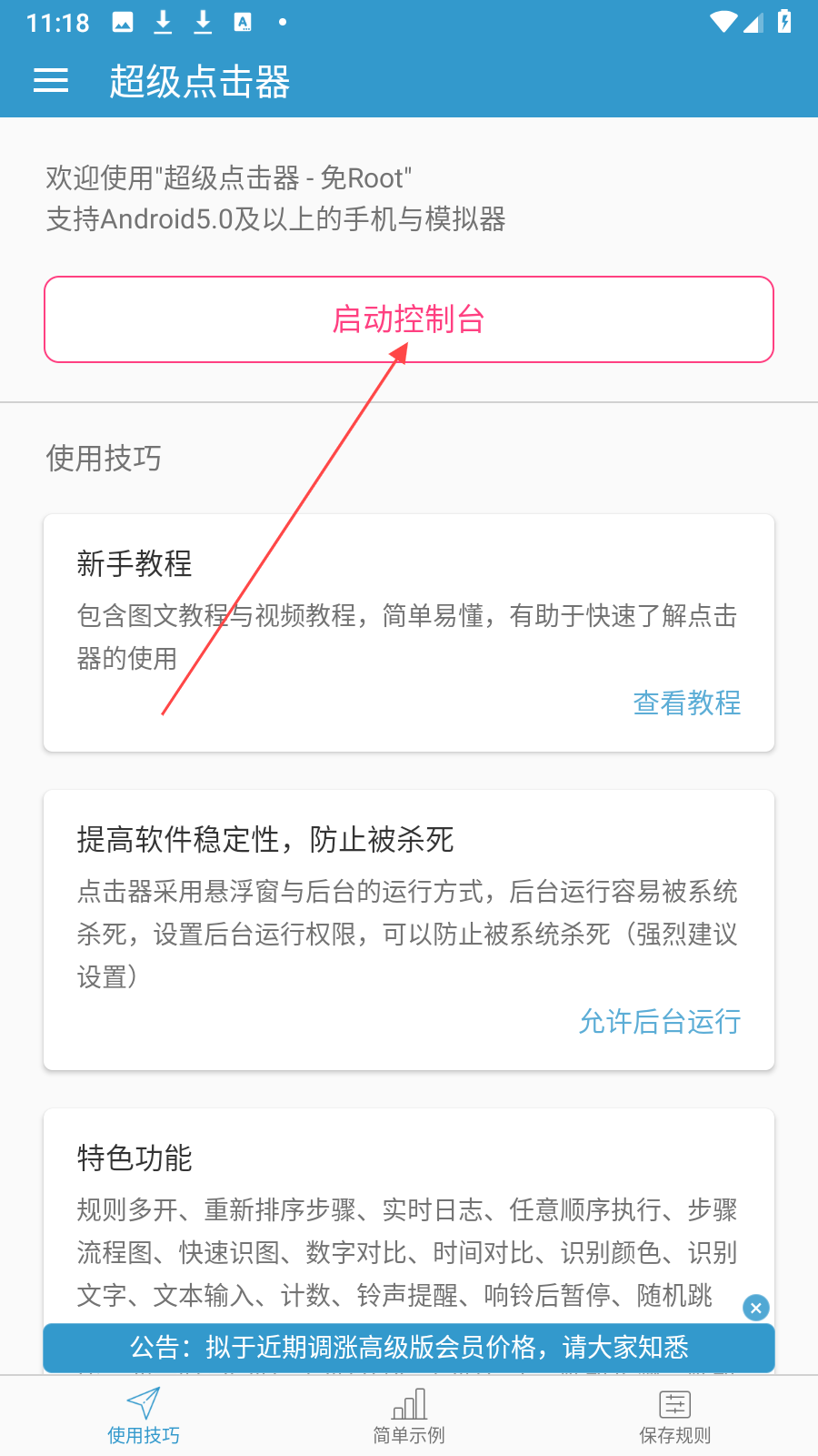 1、打開超級(jí)點(diǎn)擊器應(yīng)用,進(jìn)入主界面后,點(diǎn)擊啟動(dòng)控制臺(tái)按鈕,準(zhǔn)備開啟后續(xù)權(quán)限設(shè)置流程。