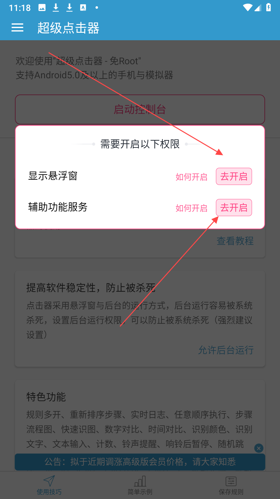 2、點(diǎn)擊啟動(dòng)控制臺(tái)后,會(huì)彈出權(quán)限提示,分別點(diǎn)擊顯示懸浮窗和輔助功能服務(wù)右側(cè)的去開啟,按系統(tǒng)引導(dǎo)完成對(duì)應(yīng)權(quán)限開啟,為正常運(yùn)行做好準(zhǔn)備。