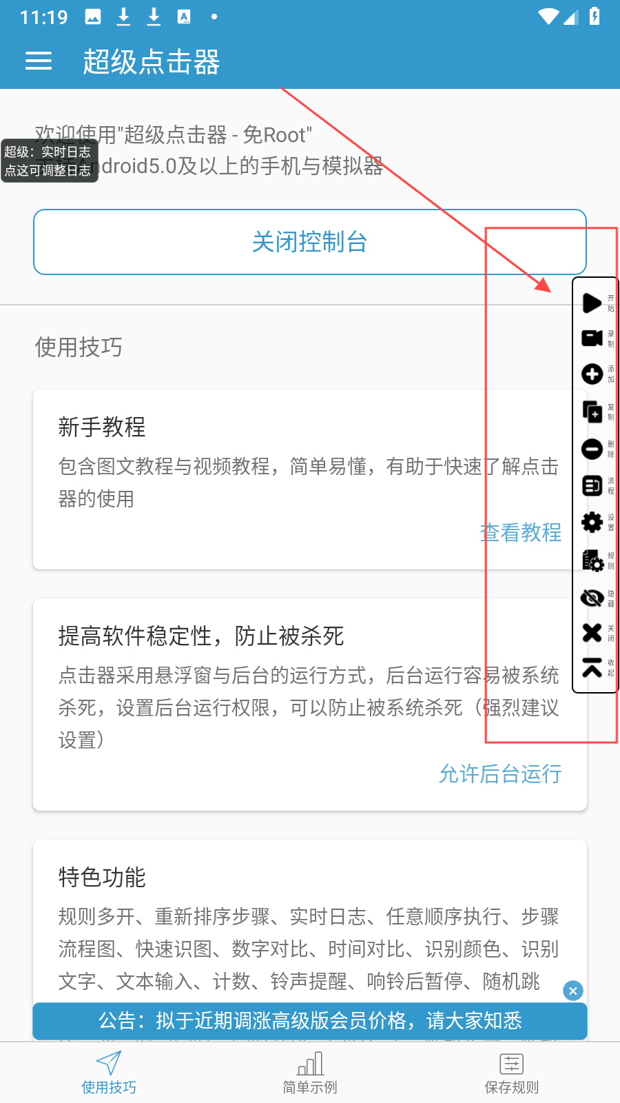 3、成功開啟權(quán)限并啟動(dòng)控制臺(tái),出現(xiàn)懸浮控制臺(tái)窗口,點(diǎn)擊開始可按規(guī)則點(diǎn)擊,錄制能錄點(diǎn)擊流程,添加可手動(dòng)加操作步驟,也能通過設(shè)置調(diào)整點(diǎn)擊間隔等參數(shù)。
