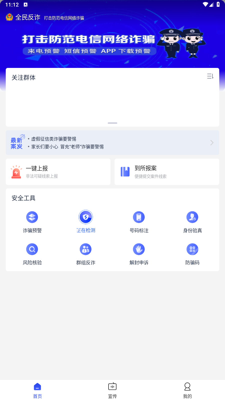 2、全民反詐騙APP具有多種功能,有一鍵上報非法線索、到所報案功能,詐騙預(yù)警、防詐檢測等安全工具。