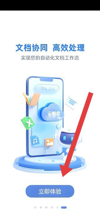 1、下載好app點擊進入應用,在文檔協(xié)同功能宣傳頁,點擊立即體驗,進入云助理的使用流程。