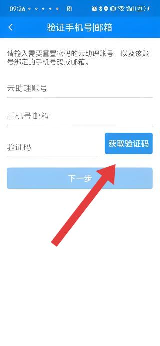 3、若忘記密碼,在驗證頁面填寫云助理賬號及綁定的手機號/郵箱,點擊獲取驗證碼,推進密碼重置流程。