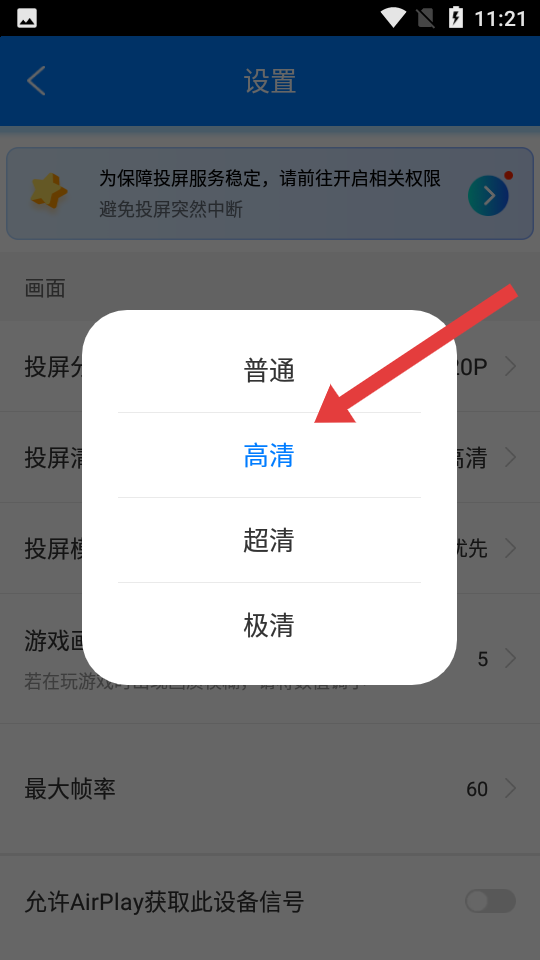 3、在設(shè)置界面,點(diǎn)擊投屏清晰度選項(xiàng),當(dāng)前顯示為高清,彈出清晰度選擇彈窗。