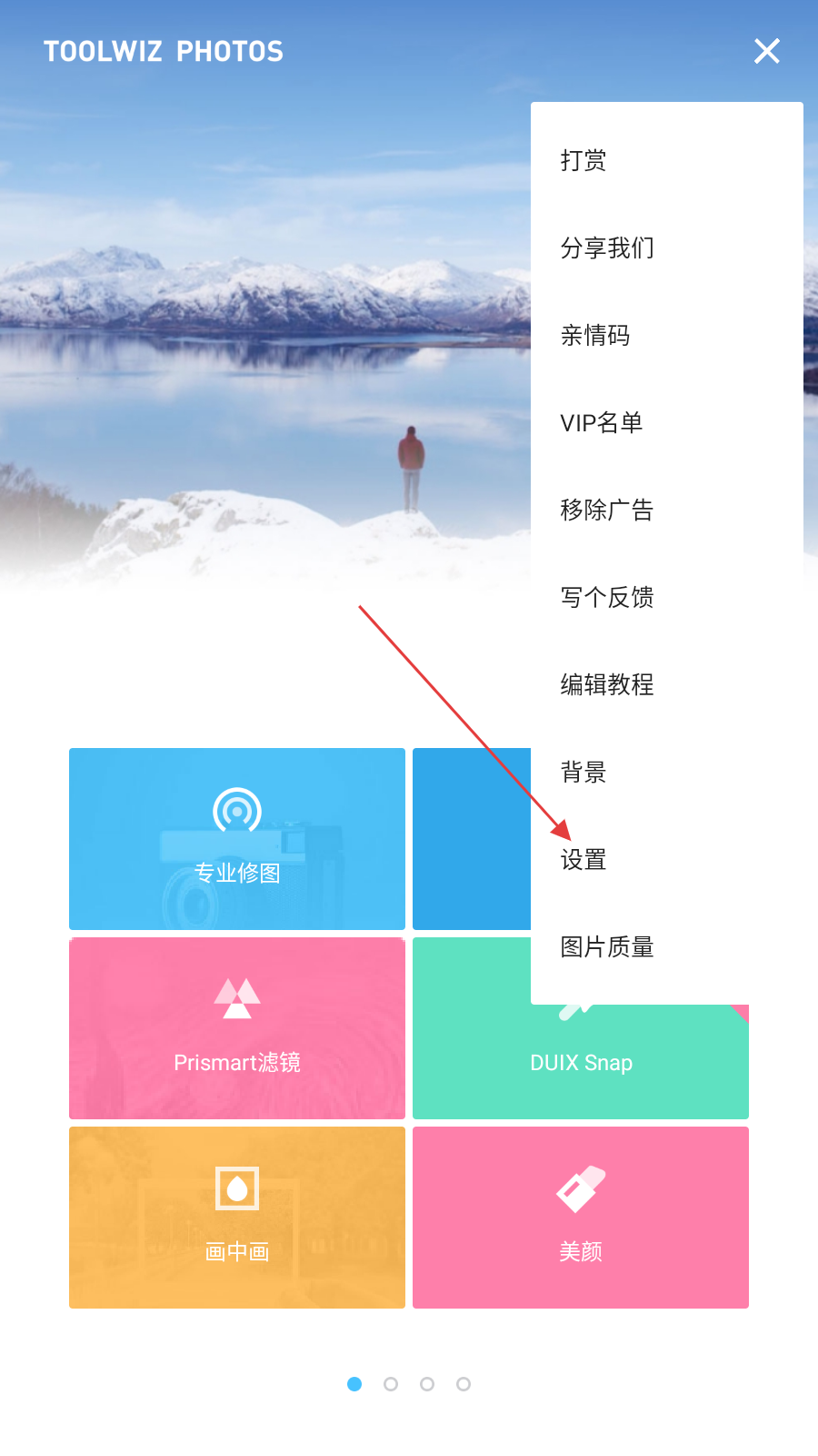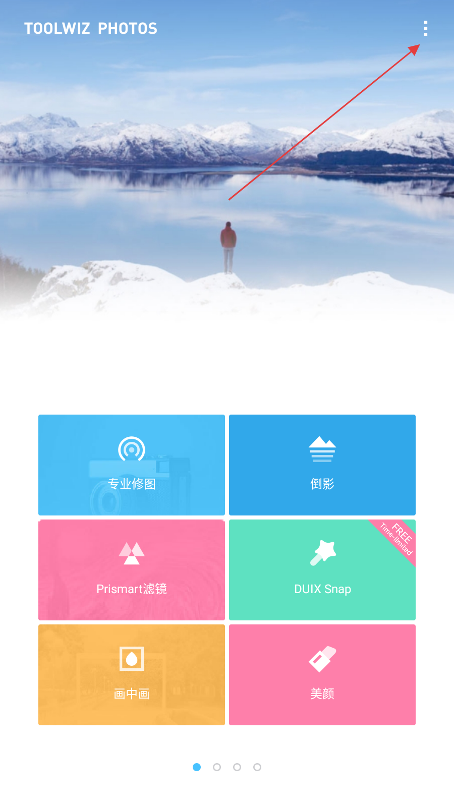 1、打開Toolwiz Photos應(yīng)用,點擊界面右上角的三點圖標(biāo),彈出功能菜單。