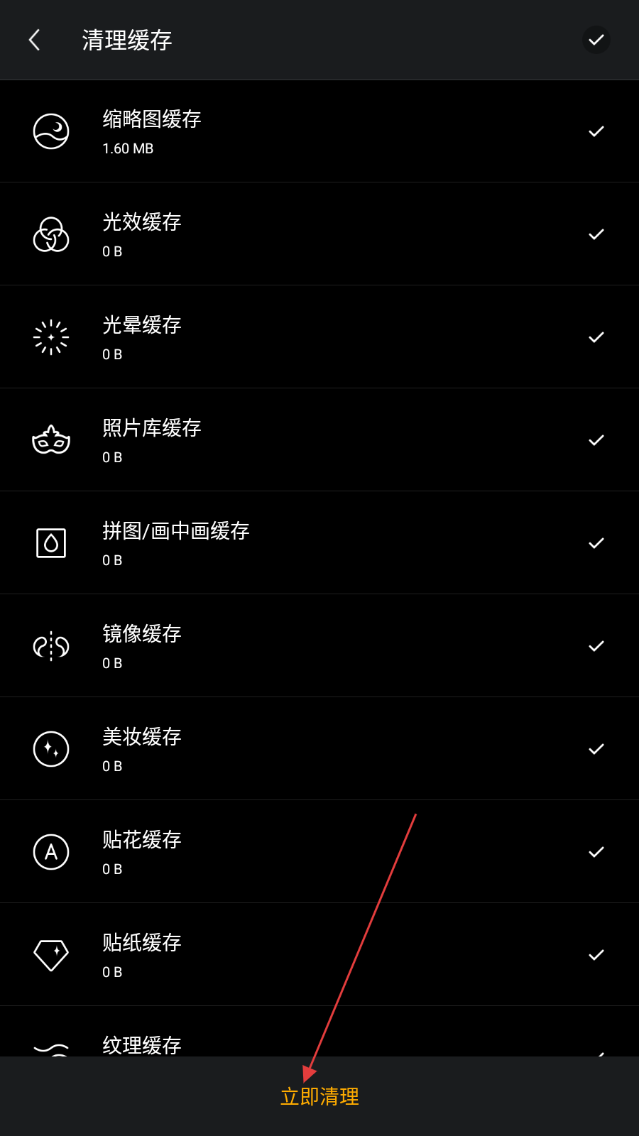 4、在清理緩存界面,可看到縮略圖緩存、光效緩存等多種緩存類型,點擊底部的立即清理按鈕,即可清除所選的緩存數(shù)據(jù)。