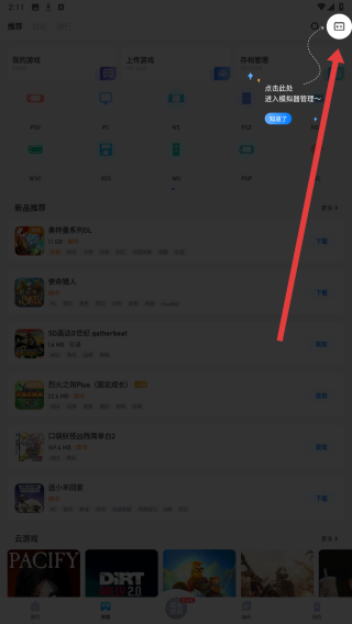 1、點擊應用首頁底部移植選項,進入游戲移植界面,可瀏覽各類游戲相關動態(tài)與資源推薦,準備下載模擬器。