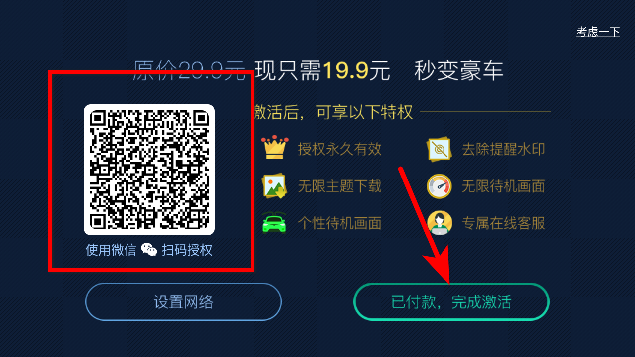 3、在激活操作頁(yè)面,使用微信掃碼授權(quán)后,點(diǎn)擊已付款,完成激活按鈕,即可完成激活操作。