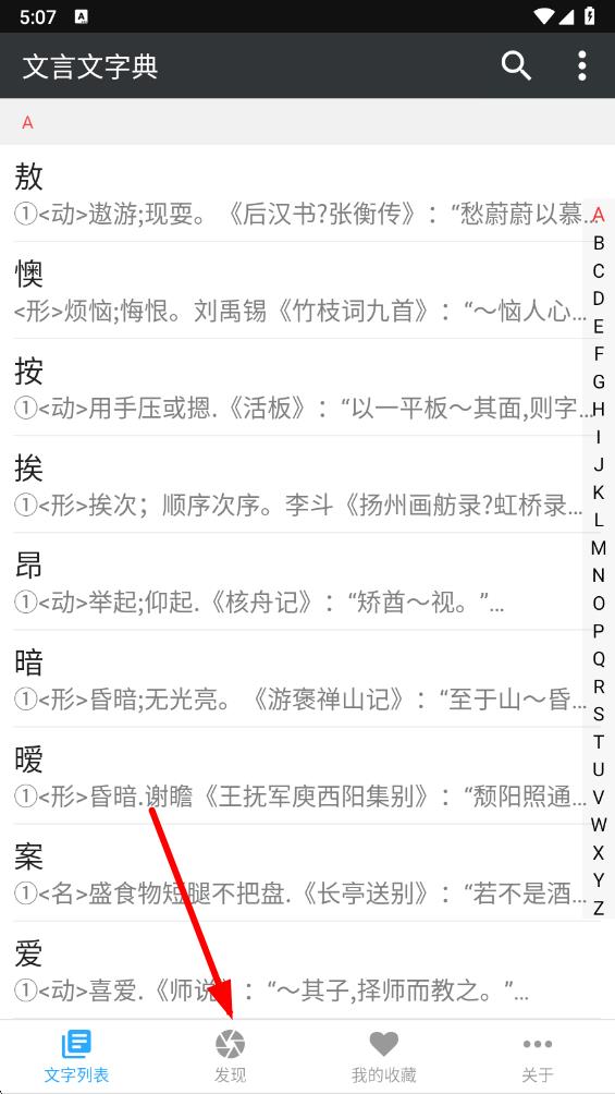 1、打開文言文字典app,點擊底部導航欄中的發(fā)現(xiàn)選項,進入發(fā)現(xiàn)頁面。