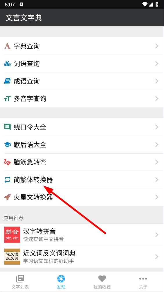 2、在發(fā)現(xiàn)頁面里,找到并點擊簡繁體轉(zhuǎn)換器選項,進入簡繁體轉(zhuǎn)換界面。