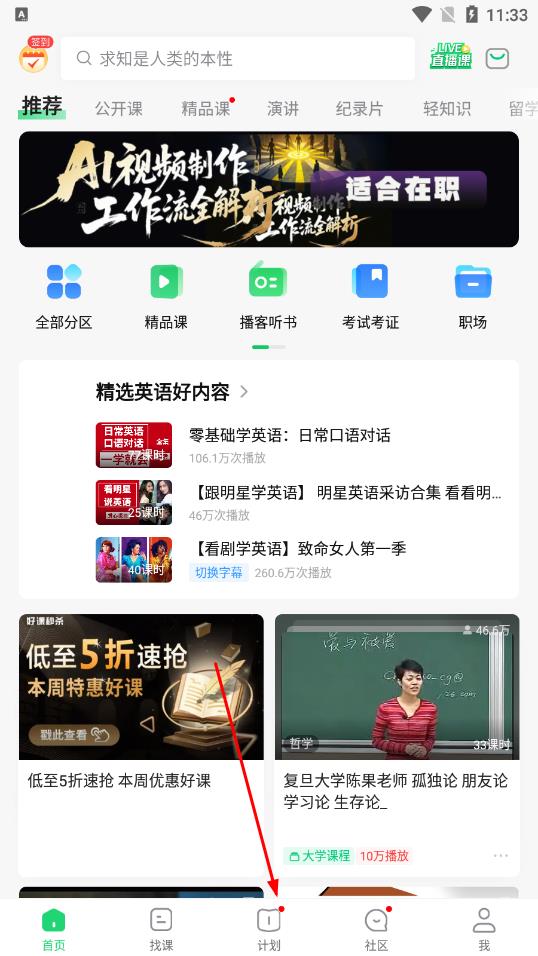 1、打開(kāi)網(wǎng)易公開(kāi)課App,進(jìn)入首頁(yè),點(diǎn)擊底部導(dǎo)航欄中的計(jì)劃選項(xiàng)。
