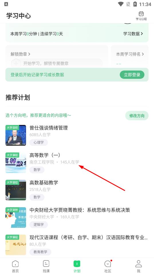 2、在計(jì)劃頁(yè)面的推薦計(jì)劃中,瀏覽找到想要加入計(jì)劃的課程,點(diǎn)擊該課程。