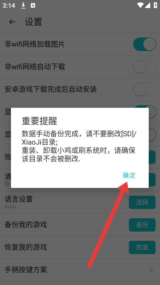 3、備份完成后,會(huì)彈出重要提醒提示框,點(diǎn)擊確定即可,此時(shí)游戲數(shù)據(jù)已成功備份至指定目錄。