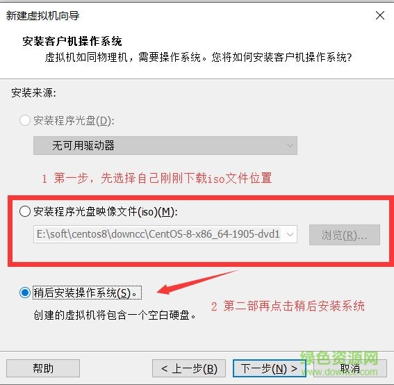 4.這里要引起注意了,首先第一步:點(diǎn)擊安裝程序光盤映像文件,然后選擇你下載好的iso文件位置→第二步:點(diǎn)擊稍后安裝操作系統(tǒng),在下一步
