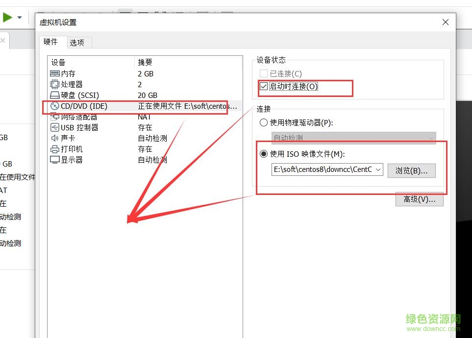 17.這時(shí)候你需要選擇cd/dvd→把右側(cè)的啟動(dòng)時(shí)連接勾選→在使用iso映像文件哪里選擇剛剛下載的iso文件,然后保存