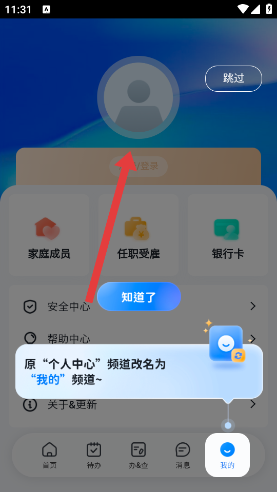 2、在我的頻道,點擊彈窗中的知道了關閉提示,隨后可以通過頭像的區(qū)域進入登錄的流程。