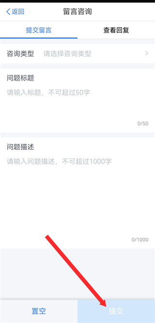 3、在頁面選擇咨詢類型,填寫問題點擊提交,即可完成咨詢申請。