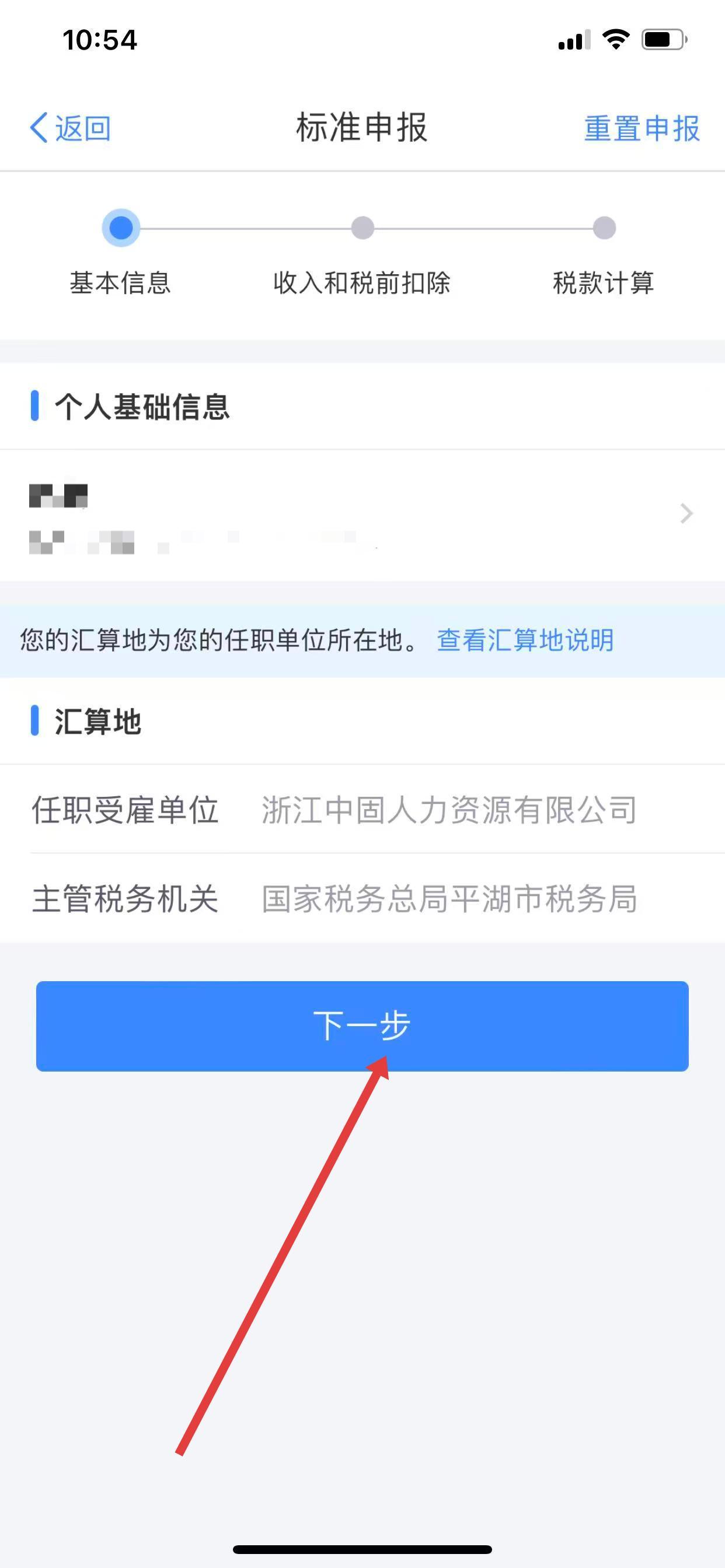 3、在標(biāo)準(zhǔn)申報的基本信息頁面,確認(rèn)個人基礎(chǔ)信息、匯算地等信息無誤后,點擊下一步。