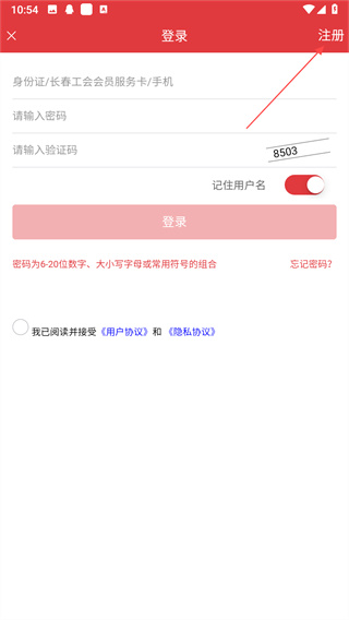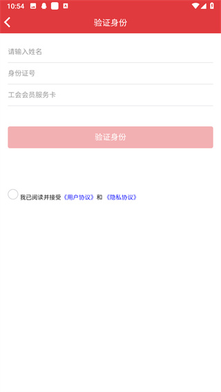 3、輸入姓名、身份證號、工會會員服務(wù)卡等信息,驗證身份,并同意用戶協(xié)議和隱私協(xié)議,即可注冊。
