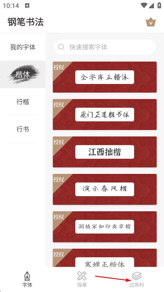 1、打開鋼筆書法APP,點擊右下角邊角料。