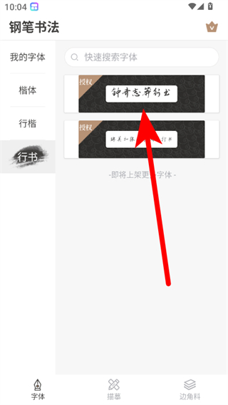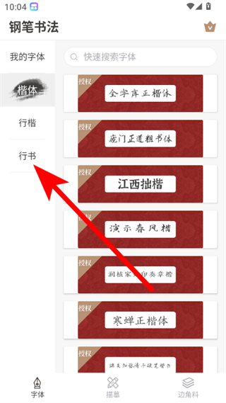 1、在鋼筆書法字體選擇頁面,點擊行書選項,進入行書字體列表界面。
