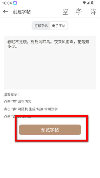 4、完成字帖類型選擇后,點擊預(yù)覽字帖按鈕,即可查看所選行書字體的電子字帖效果。
