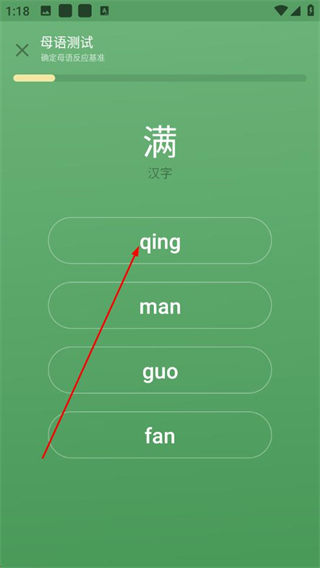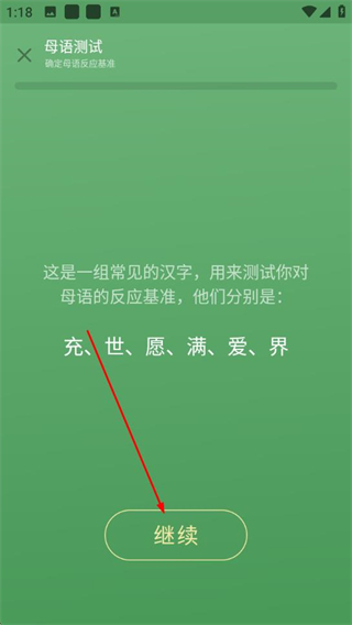 2、在母語測試環(huán)節(jié),點擊繼續(xù),參與漢字讀音測試,確定母語反應基準。