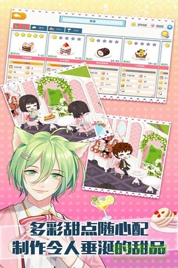 玩家需要使用操作臺(tái)制作及研發(fā)甜品,甜品分為4大類,共40種甜品,通過(guò)升級(jí)、任務(wù)等解鎖新品,同時(shí)料理最高可以提升到5星級(jí),升星會(huì)增加各種屬性;制作甜品需要消耗相應(yīng)食材及店員體力值,研發(fā)升級(jí)需要消耗體力值。