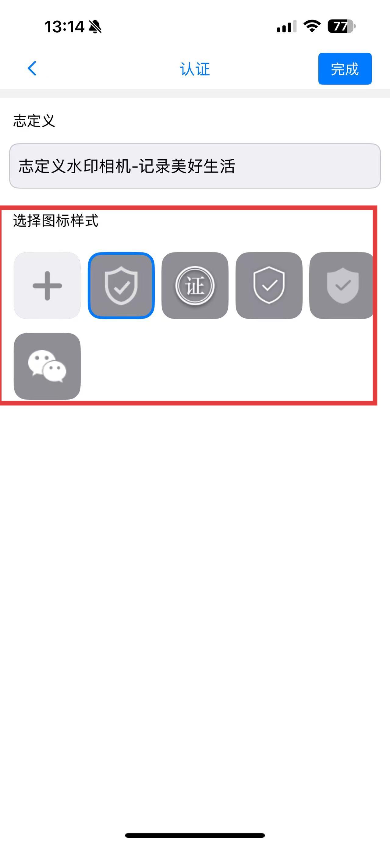 4、輸入完成后,還能在選擇圖標(biāo)樣式區(qū)域挑選喜歡的圖標(biāo)樣式,最后點(diǎn)擊完成按鈕,即可修改水印認(rèn)證信息。