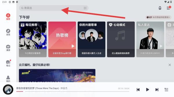 1、打開網(wǎng)易云音樂APP,在首頁頂部或任意頁面的頂部欄找到搜索框,顯示搜索歌手、歌曲、專輯提示文字。