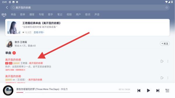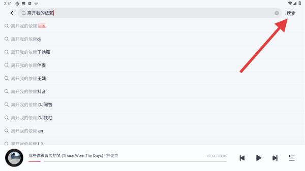 2、用戶搜索關(guān)鍵詞時可以直接搜歌名、歌手名、專輯名,點擊搜索后可馬上開始搜索相關(guān)的歌曲。
