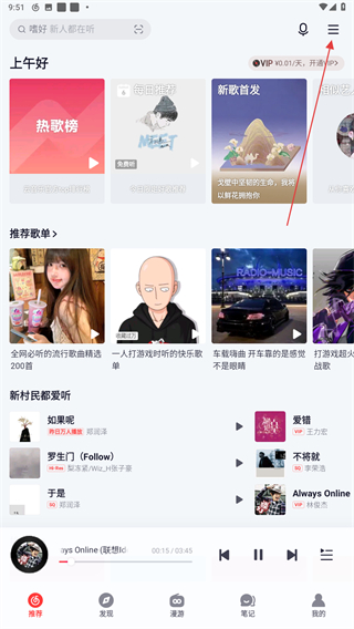 1、打開網(wǎng)易云的軟件,在首頁點擊上方三個橫線的按鈕。
