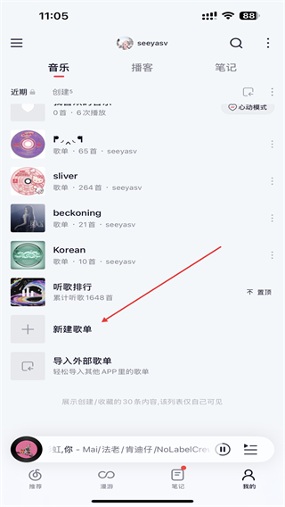 2、進入我的頁面內(nèi),點擊下方新建歌單的按鈕。