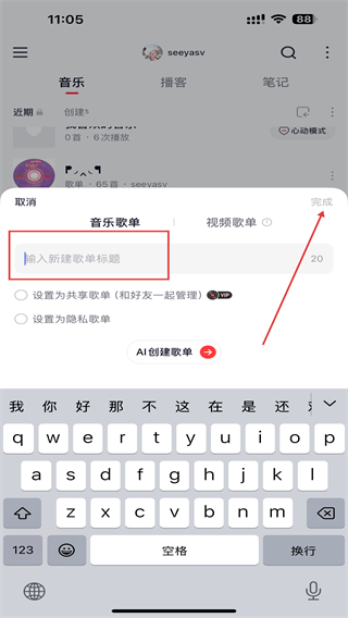 3、輸入歌單名稱后,點擊完成的按即可建成功。