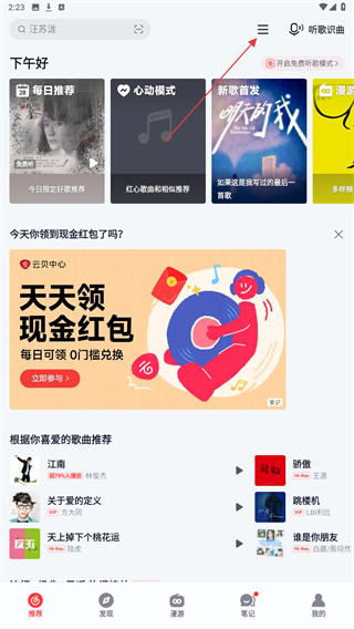 1、打開網(wǎng)易云音樂APP,進入首頁點擊右上的功能圖標。