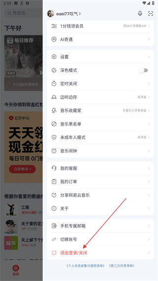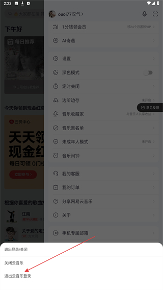 3、在下方彈出的界面內(nèi),選擇并點擊退出云音樂登錄即可完成。