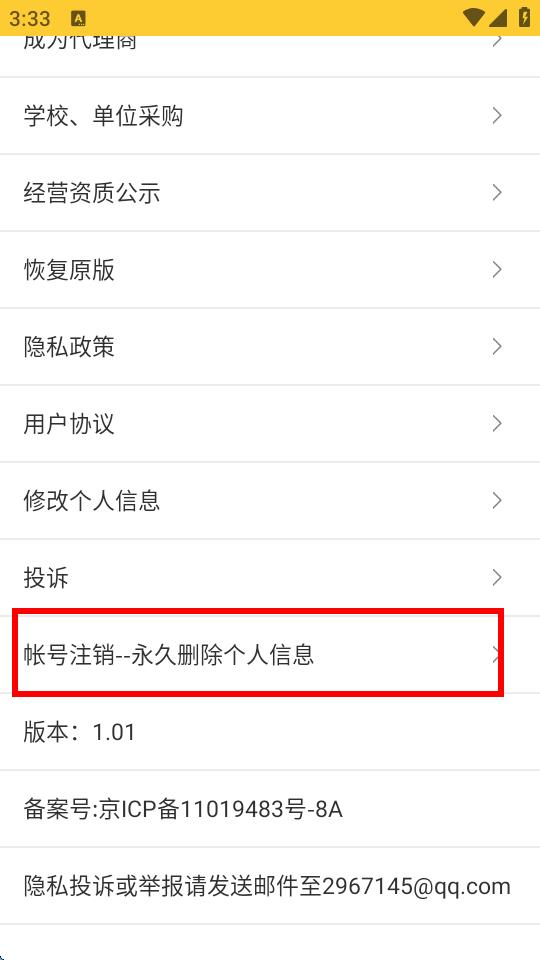 2、進(jìn)入設(shè)置頁面后,下滑找到帳號注銷--永久刪除個(gè)人信息選項(xiàng)并點(diǎn)擊。