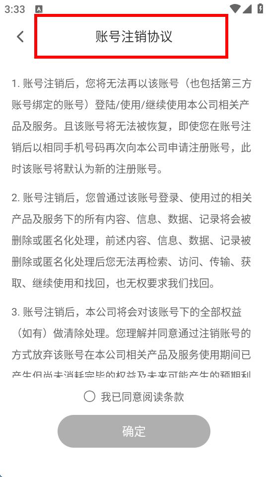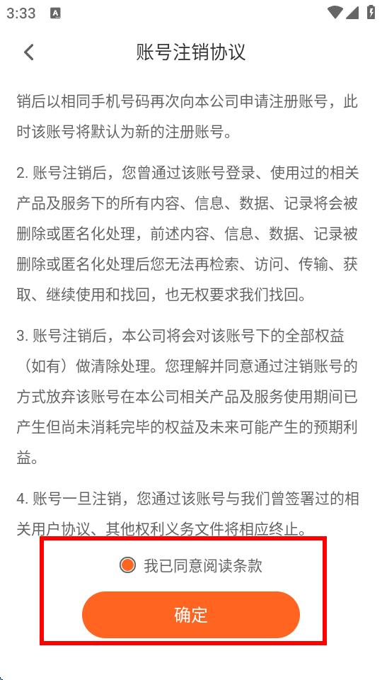 4、閱讀完畢后,勾選我已同意閱讀條款,再點(diǎn)擊確定按鈕,即可按照提示流程完成賬號注銷。