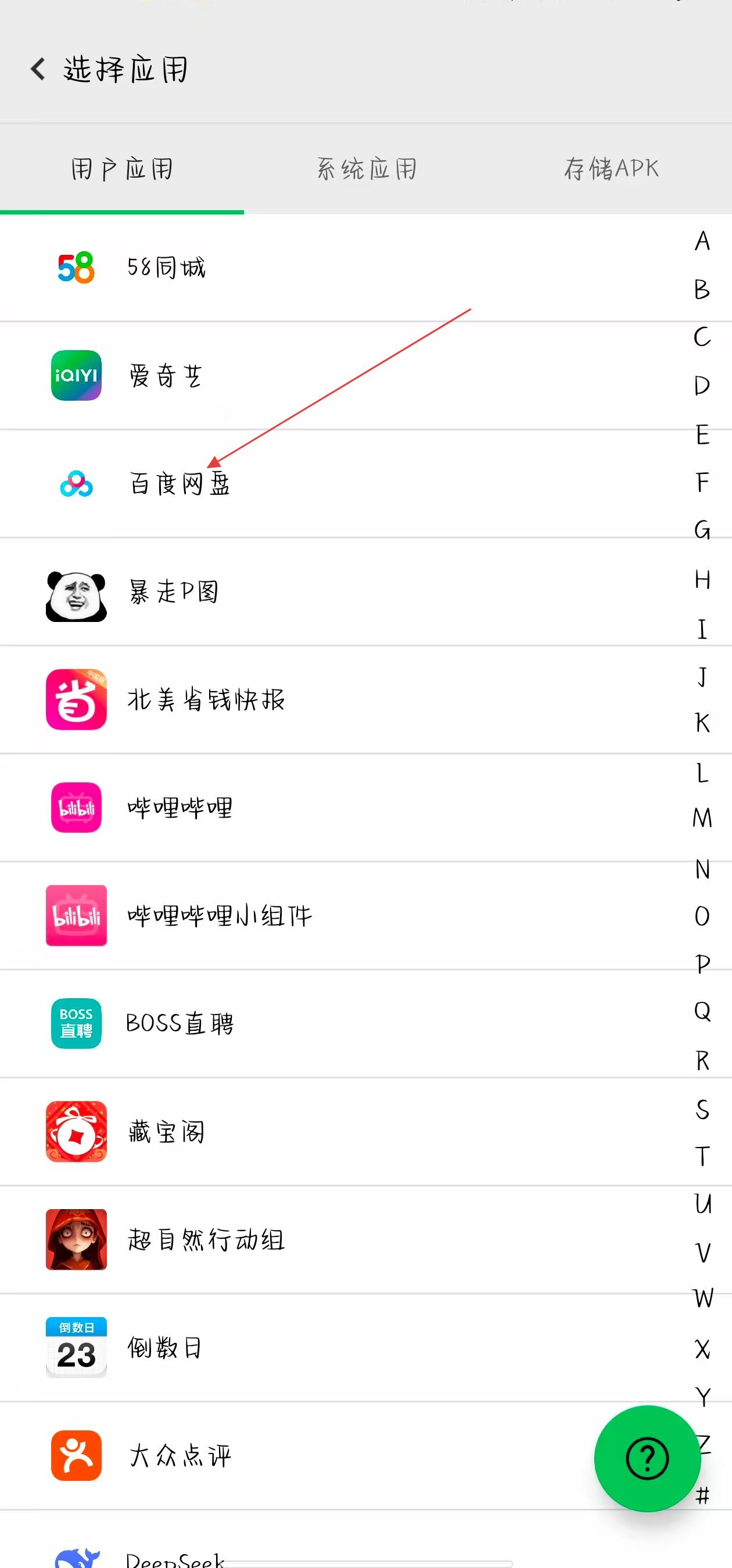 2、在選擇應(yīng)用頁(yè)面,會(huì)展示用戶手機(jī)中已安裝的應(yīng)用列表,在用戶應(yīng)用分類下找到想要添加分身的應(yīng)用,比如百度網(wǎng)盤。