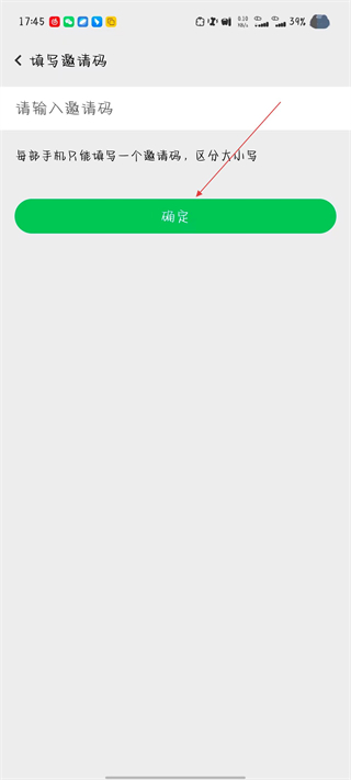 4、在輸入框中輸入邀請(qǐng)碼,點(diǎn)擊確定按鈕,完成邀請(qǐng)碼輸入。