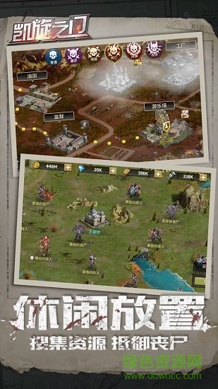 資源,建造農(nóng)田、伐木場、礦井收獲資源并增強城市與軍隊PVE,探索關(guān)卡,搜尋科技材料,升級科技與建筑物科技,提高生產(chǎn)、輔助和士兵等屬性。