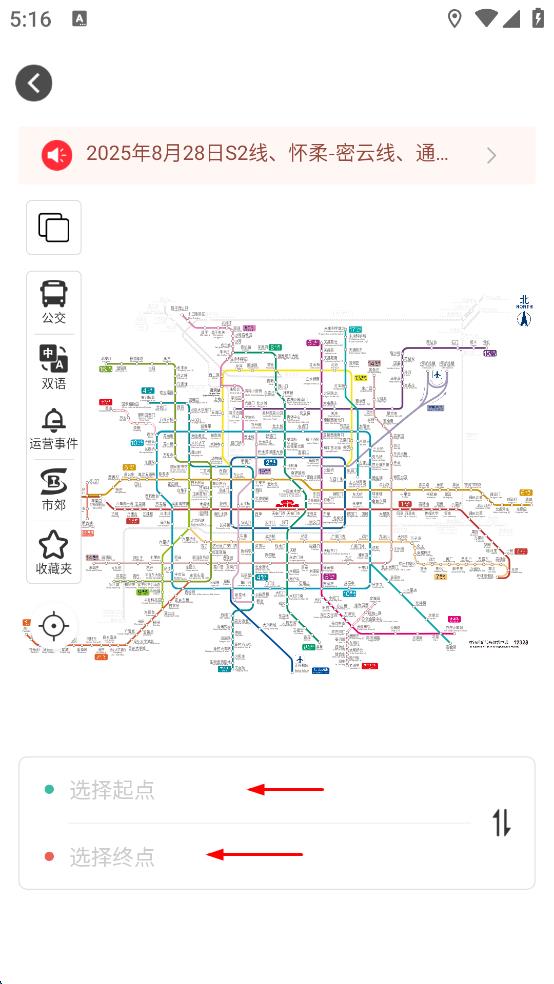 2、在線路查詢頁,點擊“選擇起點”,從地鐵線路圖或搜索中選定出發(fā)站點,再點擊“選擇終點”確定到達站點。