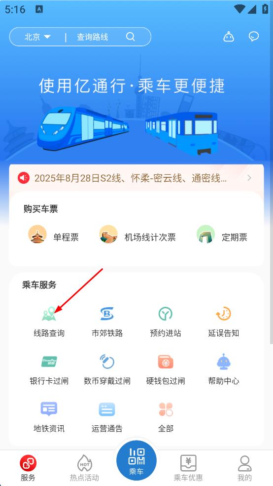 1、打開億通行APP,點擊底部“服務”,進入服務頁面,在乘車服務中選擇“線路查詢”,進入查詢界面。